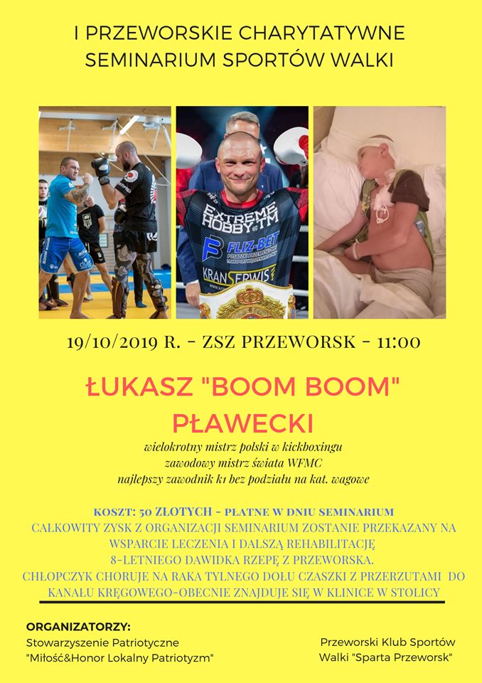 Seminarium kick boxingu będzie miało charakter charytatywny, a celem głównym będzie wsparcie w leczeniu i rehabilitacji 8-letniego Dawidka Rzepy z Przeworska, który choruje na raka i przebywa teraz w warszawskiej klinice.