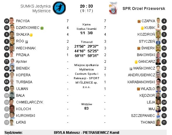 Jedynka Myślenice – Orzeł Przeworsk 20:33 (9:17)
