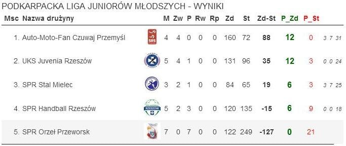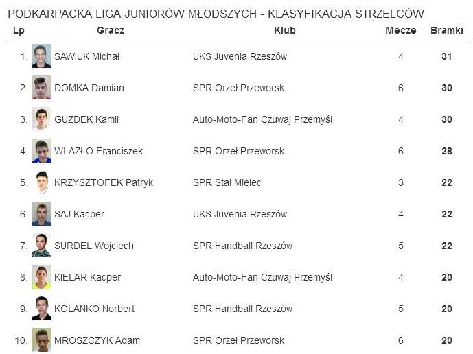 W Podkarpackiej Lidze Juniorów Młodszych nasi najmłodsi Orłowcy rozegrali 7 mecz w sezonie. Wyjazd do Juvenii zakończył się wysoką porażką 45:22. W naszej drużynie najskuteczniejszym był Franciszek Wlazło strzelec, aż 10 bramek. Mimo nie najlepszych wyników nasi piłkarze ręczni dobrze sobie radzą w klasyfikacji strzelców, aktualnie mamy 3 zawodników w 10-tce najskuteczniejszych piłkarzy. Wprawdzie mamy rozegranych więcej meczów od przeciwników, ale w tej materii oni muszą gonić osiągnięcia naszych zawodników.