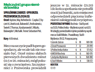 Orłowcy wysoko postawili warunki drużynie Górnika Zabrze. Mecz miał kilka faz, raz gospodarze, raz Orzeł prowadził w meczu. Jednak znów końcówka była nie dla naszego zespołu. Szkoda, bo lider był w tym dniu do pokonania.