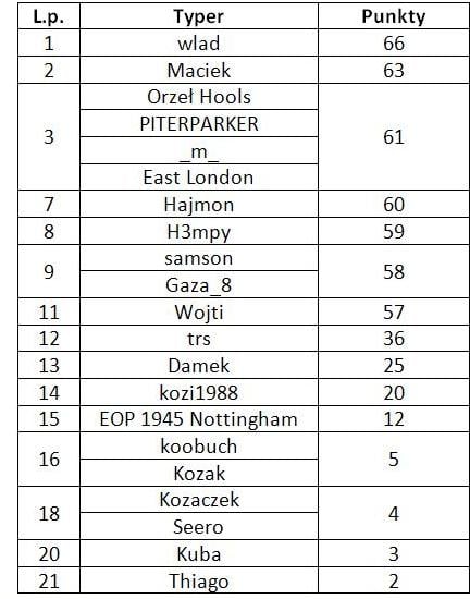 Typer Liga Typerów – wyniki 15 kolejki 2019-11-20 samson Wyniki 15 kolejki w Lidze Typerów: 6 punktów: East London 5 punktów: wlad, H3mpy 4 punkty: Gaza_8, _m_, PITERPARKER, Hajmon, Wojti 3 punkty: Orzeł Hools, samson, Maciek Klasyfikacja generalna: 52