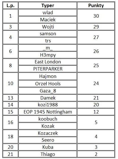 Wyniki kolejki nr 7 są dość dobre dla naszych Typerów, a najlepszym w tej kolejce okazał się Maciek z 7 trafnymi typami.