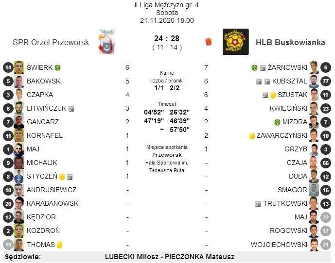 Zespół z Buska lepiej wszedł w mecz i w 9 minucie prowadził 5:1. Od tego momentu Orzeł poprawił grę i w 15 minucie doprowadził do remisu 6:6. Niestety był to tylko chwilowy błysk lepszej gry Orłowców, bo kolejne minuty znów należały do buszczan, którzy w 19 minucie objęli prowadzenie 10:7. Po przerwie Buskowianka jeszcze bardziej poprawiła grę i w 40 minucie wygrywała 20:13. Już do końca spotkania jej przewaga nie spadła poniżej trzech bramek różnicy. Zatem nie udał się rewanż na Buskowiance.