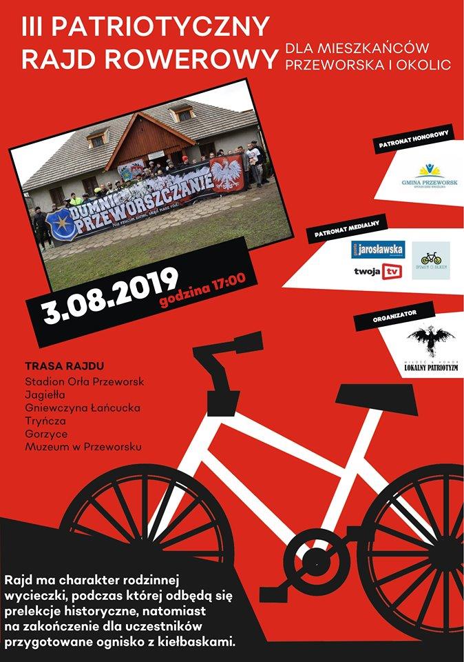 Już w sobotę, 3 sierpnia br. od godziny 17:00 ze stadionu przeworskiego Orła wyruszy III patriotyczny rajd rowerowy organizowany przez środowiska młodzieży patriotycznej z Przeworska. Tegoroczne wydarzenie to rowerowa wycieczka historyczna trasą obejmujące miejsca związane z okresem II wojny światowej, a więc: Jagiełła (cmentarz ofiar hitleryzmu), a następnie Gniewczyna Łańcucka (pomnik gen. Antoniego Chruściela), w tych oto miejscach przygotowane będą choreografie patriotyczne i historyczne. Kolejnymi miejscami na mapie rajdu jest Tryńcza, Gorzyce, Gorliczyna, a zakończenie wraz z grillem dla uczestników planowane jest w przeworskim parku. Rajd rowerowy skierowany jest do całych rodzin, będzie to spokojna wycieczka rowerowa, aby z pamięcią i godnością pamiętali o bohaterach walk z 1944 roku. Wydarzenie wspiera Wójt gminy Przeworska Pan Daniel Krawiec, który objął patronatem honorowym inicjatywę Stowarzyszenia Patriotycznego Miłość & Honor Lokalny Patriotyzm.