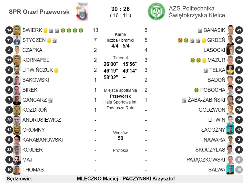 Orłowcy po dobrym meczu wygrali pewnie z Politechniką Kielce. Goście w końcówce próbowali odrobić straty jednak nasi piłkarze ręczni w tym dniu byli nie do pokonania i zgarnęli 3 punkty. Bardzo dobre zawody rozegrał nasz najlepszy strzelec Mateusz Świerk zdobywca 13 bramek, który po 2 kolejkach jest najskuteczniejszym strzelcem II ligi z 24 bramkami na koncie.